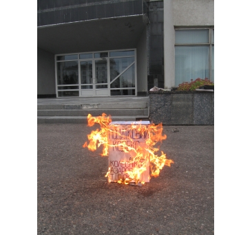 После нескольких выступлений организаторы акции приступили к торжественному сожжению макета Налогового кодекса: они облили его бензином и подожгли под бурные овации предпринимателей.