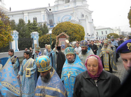 На ул. Соборной около храма к 11.00 уже выстроилась национальнаягвардия в красивых жилетах. Некомпетентные сумчане спрашивали у компетентных:"Что это такое, или приехал кто?!" "Вот так мы помним свои святыни!" - с легким упреком отвечали те, кто святыни помнит. В Спасо-Преображенском соборе в это время служили литургию в честь чудотворной иконы Шпилевской Богоматери, которая сейчас пребывает у нас, в этом храме. А потом священство и верующие вышли на крестный ход с этой иконой, процессия проследовала по маршруту: ул. Соборная - пл. Независимости, – Набережнаяй р. Стрелки к Ильинской церкви, завершилось шествие на на месте разрушенного Покровского храма на Покровской площади. Как нам сказали, на чествование иконы собралось священство со всей епархии, мирян в крестном ходе участвовало тоже достаточно много, если учесть, что день рабочий. Следует отметить, что при проведении крестного хода соблюдался порядок, большая масса людей проследовала своим маршрутом, не задерживая надолго уличное движение. Православные верующие почтили свою святыню, как и подобает, как делают это из года в год.