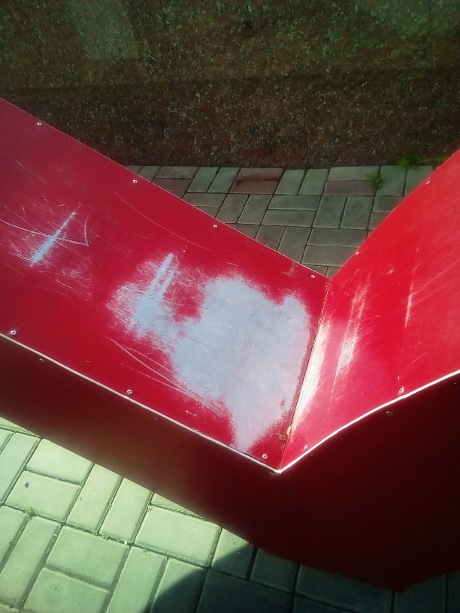 Увы, сумчане, видимо, не могут оценить такую красоту. Из-за этого знак понемногу начинает терять привлекательность. Так, многие любят садиться в сердечко для красивой фотографии, из-за чего место "для сидения" уже покрылось царапинами и даже протёрлось.