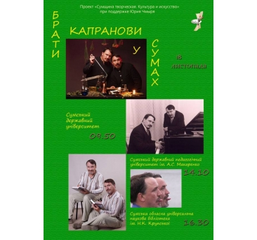 Творческие встречи с Виталием и Дмитрием Капрановыми пройдут в Сумском государственном университете в 09.50, Сумском государственном педагогическом университете им. А.С. Макаренко в 14.10 и в Сумской областной универсальной научной библиотеке им. Н. К. Крупской в 16.30.