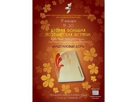 17 января в 17:30 в рамках проекта «Сумщина творческая. Культура и искусство» в Сумской муниципальной галерее "СМуГа" (г. Сумы, ул. Соборная, 27) состоится «Вторая большая поэтическая встреча». Мероприятие приурочено презентации киевского литературного альманаха «Каштановый дом», где были опубликованы произведения 25 поэтов Сумщины (все они – члены Сумской областной литературной студии «Лит-ра.com»).