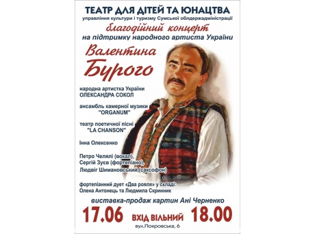 17 июня в 18.00 в ТЮЗе состоится благотворительный концерт в поддержку народного артиста Украины Валентина Дмитриевича Бурого, который находится на лечении.