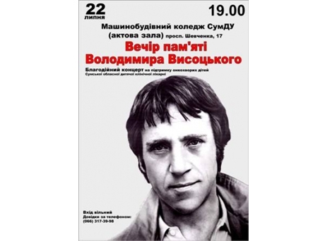 Сегодня , 22 июля, в актовом зале Машиностроительного колледжа СумГУ состоится благотворительный концерт: «Вечер памяти В.Высоцкого» в пользу онкобольных детей, которые лечатся в Сумской областной клинической больнице.