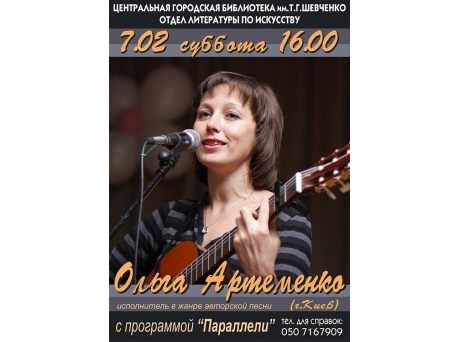 7 февраля в 16:00 в отделе литературы по искусству Центральной городской библиотеки им. Т.Г. Шевченко состоится творческая встреча с Ольгой Артеменко (г. Киев), которая представит слушателям свою программу «Параллели».