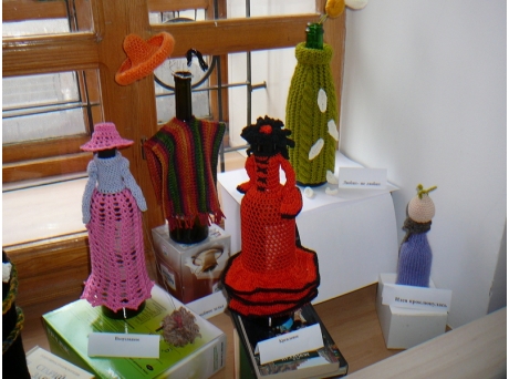 Тут можно увидеть замечательные рукодельные фантазии Ольги Юдиной, когда на бутылки из-под разнообразных напитков надеваются мастерски вывязанные фигурки, схематически изображающие различных характерных персонажей. Получилось одновременно красиво, необычно, иронично и серьёзно. Частью данной экспозиции стал и оригинальный арт-объект от художницы Полины Кубраковой, при изготовлении которого также были использованы бутылки.