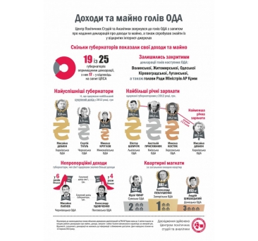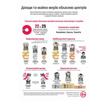 22 из 25 мэров областных центров открыли свои декларации, из них 13 — в ответ на запрос ЦПСА. Закрытыми остались декларации об имуществе и доходах мэров Запорожье, Херсона, Чернигова. 19 из 25 губернаторов обнародовали декларации, из них 17 — в ответ на запрос ЦПСА.