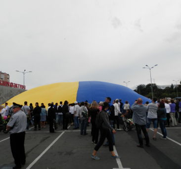 флаг Украины, площадь которого составляла 2400 кв.м., размеры 40х60 м. К установлению рекорда присоединились несколько сотен сумчан, а инициатором выступил Сумской городской центр досуга молодежи.