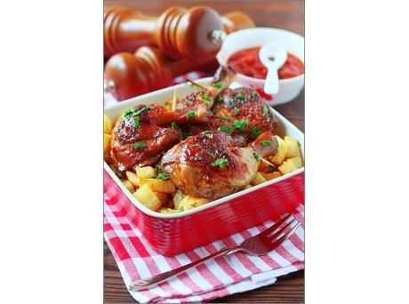 5. Открыть фольгу и готовить ещё 20 минут,поливая образовавшимся соком.На гарнир можно подать жаренный во фритюрне картофель и любой любимый соус или домашнюю аджику.