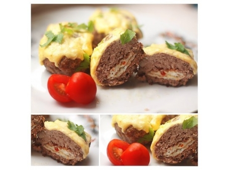 Сделаем из фарша лепешки, внутрь положим наш омлет и сформируем зразы. Обжарим зразы с двух сторон на растительном масле, после чего выложим на противень.