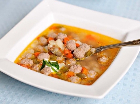 Когда фрикадельки готовы, добавьте помидоры. Всыпьте и остальные овощи, чеснок. Перемешайте. Добавьте специи. Влейте 6 стаканов кипяченой воды. Перемешайте все тщательно. Продолжайте варить до полуготовности овощей.