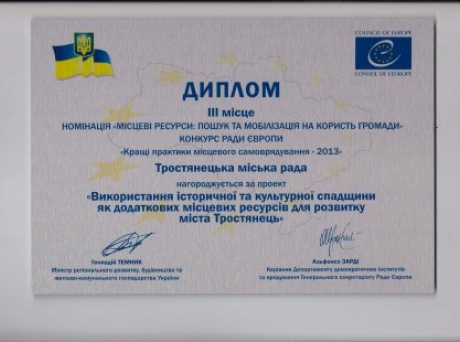 Тростянецкий горсовет занял ІІІ место в категории "Местные ресурсы: поиск и мобилизация в интересах общества" за «Использование исторического и культурного наследия как дополнительных местных ресурсов для развития города Тростянец».