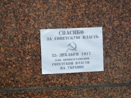 На монумент была наклеена надпись «Спасибо за Советскую власть».