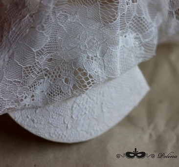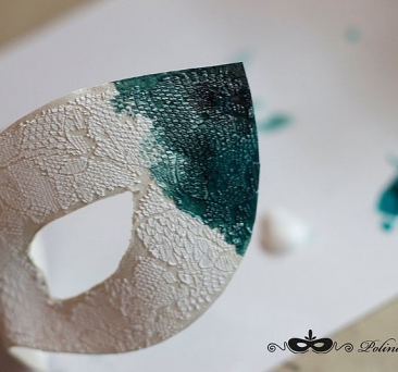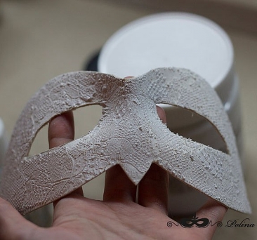 1. Для начала приложим кружево к основе маски и прикинем, где будет находиться узор. Поверхность получится более интересной, если кружево будет иметь сложный рисунок с большими и маленькими дырочками.