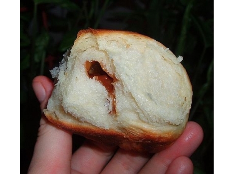 После, делаем булочки и укладываем начинку (по половинке конфетки), помещаем в смазанную растительным маслом форму. Смазываем взбитым яйцом.