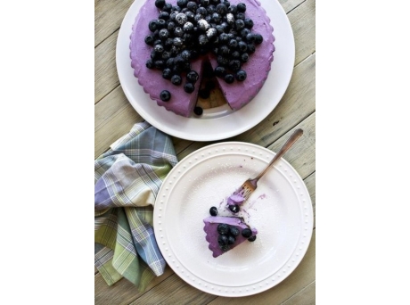 Взбейте сливки. Смешайте сливочный сыр с сахаром с лимонным соком,влейте черничный сок и взбитые сливки. Перемешайте эту массу до однородности. Выложите поверх основы из печенья. Распределите равномерно.