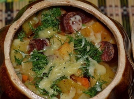 Почистить картошку, нарезать кубиками, затем нарезать колечками колбаску охотничью. Обжарить морковь с ложкой томатной пасты и водой. Добавить все в картофель. Добавить чеснок, соль, перец, гвоздику. Все перемешать и ставить в горшочках в духовку на 45 мин. Затем вытянуть и добавить сыр и зелень.