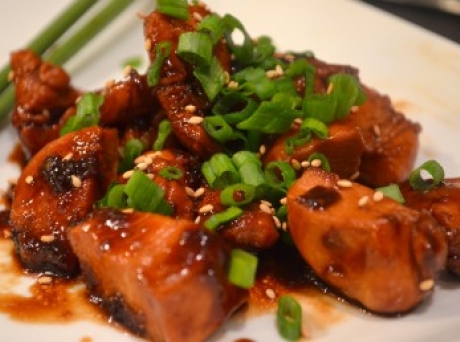 Нарезать куриное филе кубиками и добавить в приготовленный соус. Перемешать и дать постоять 20 минут, чтобы мясо пропиталось соусом.
