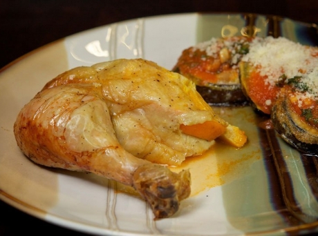 4. Аккуратно поднимите кожу на грудке курицы и проложите апельсиновые кружки между мясом и кожей. Переверните курицу и сделайте то же самое на спине.