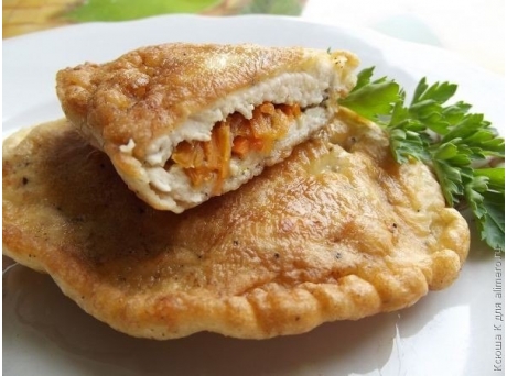 На кусочек мяса выкладываем морковку и прикрываем другим кусочком мяса. Обмакиваем в кляре и жарим на растительном масле в сковороде.