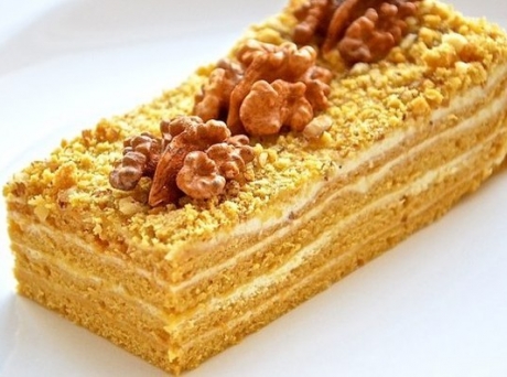 Мед положить в кастрюлю и на медленном огне довести до кипения, снимите с огня, добавьте соду и быстренько перемешайте — масса станет белой и пышной. Остудите немного мед и введите его в яично-масляную массу.
