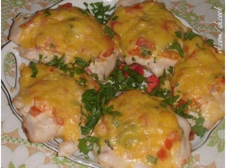 2. Сверху уложить креветки размороженные, помидор (мелким кубиком), майонез, перец свежемолотый. Сверху присыпать тёртым сыром и поставить в разогретую духовку на 20 минут при 220*.