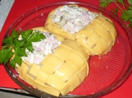 Дальше - плетение. Берем сыр, разрезаем каждый ломтик на полоски и переплетаем. Потом этой плетенкой накрываем носок лаптя, а задник и боковые стенки декорируем остатками сырных полосок, по возможности переплетая их между собой.