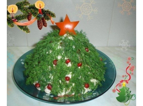 Принимаемся за украшение нашей новогодней красавицы – выкладываем веточки укропа по подобию настоящих веток. В вершину елки укладываем морковную звезду. Вареное яйцо натираем на мелкой терке (желток отдельно от белка). Натертую белковую массу выкладываем как основу будущей «гирлянды». Саму гирлянду формируем из зерен кукурузы. Также выкладываем натертый желток - основой другой гирлянды, в роли которой выступят ягоды клюквы.