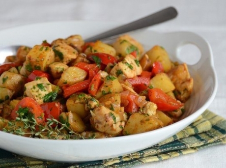 В сковороду к индейке сложить нарезанный кубиками картофель. Через 10 минут добавить нарезанный лук и красный болгарский перец. По вкусу приправить солью и перцем. Обжаривать все вместе еще 10 минут.