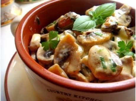 Шампиньоны очистить и нарезать на кусочки по размеру как мидии.