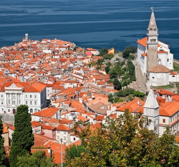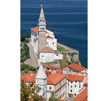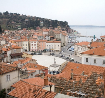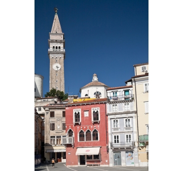 Знаменитая Пиранская овальная площадь находится в самом центре, и носит имя известного скрипача Джузеппе Тартини, который был уроженцем этого городка. На площади рядом с памятником музыканту расположены часы с боем, которые каждые пятнадцать минут отбивают не только четверти, но и голосовым сообщением напоминают, который час. А если по старинной городской лестнице, которая находится сразу за башенными часами, подниматься вверх — можно выйти к средневековой церкви. Здесь сохранились остатки крепостной стены, с которой открывается прекрасный панорамный вид на Триестский залив и на весь город.