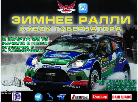 2 марта 2013 года, состоится грандиозное мероприятие которого ждали все: Зимнее ралли "Кубок губернатора". Начало в 12:00. Место проведения: ипподром в с. Патриотовка. Маршрутное такси будет курсировать от станции "Аэропорт" до ипподрома с 11:00 до 13:00.