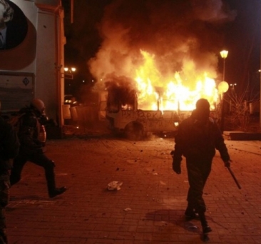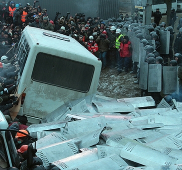 19 января, 21:28. Активисты с периодичностью продолжают забрасывать правоохранителей камнями и плитами. Правоохранители продолжают забрасывать активистов светошумовыми и газовыми гранатами. Время от времени активисты предпринимают попытки поджечь автобусы и грузовые военные автомобили, которыми перекрыта ул. Грушевского, однако силовикам удается потушить транспорт.