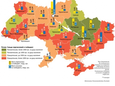 К примеру, на одного донетчанина за шесть месяцев прошлого года пришлось 2126 грн, перечисленных области из госбюджета, что соответствует 20-му месту. Львовяне — с показателем 140 грн перечислений в центральный бюджет — остались на шестом. Киевляне также сохранили за собой 26-е место — объем субсидий и дотаций из госбюджета в расчете на одного жителя столицы составил 4072 грн. Это самый худший показатель из всех регионов. Зато на первом месте неожиданно оказалась Полтавская область. Регион перечислил в бюджет по 3757 грн в расчете на душу населения.
