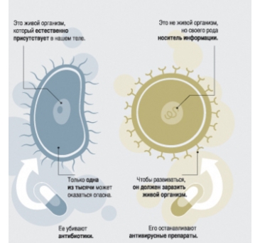 Вирус размножается, лишь попав в клетки нашего организма. Антибиотики в случае вирусных заболеваний (гриппа, насморка…) неэффективны. Лечат их противовирусными препаратами, устроенными по совершенно иному принципу (например, лекарствами, содержащими фрагменты ДНК, которые встраиваются в ДНК вируса и предотвращают его размножение).