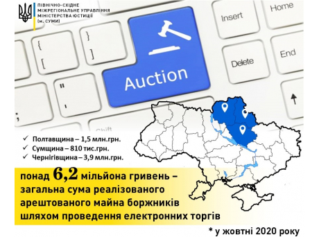 Понад 6,2 мільйона гривень – загальна сума реалізованого арештованого державними виконавцями Північно-Східного міжрегіонального управління Міністерства юстиції (м. Суми) майна боржників шляхом проведення онлайн-аукціонів OpenMarket (ДП “СЕТАМ”) у жовтні 2020 року.