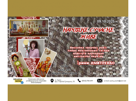 Друзі! Запрошуємо вас помилуватися чудовими роботами відомої сумської художниці, члена Національної спілки майстрів народного мистецтва України Ірини ДМИТРЕНКО. Відкриття виставки відбудеться 9 жовтня (четвер) о 16-00. Ласкаво просимо!